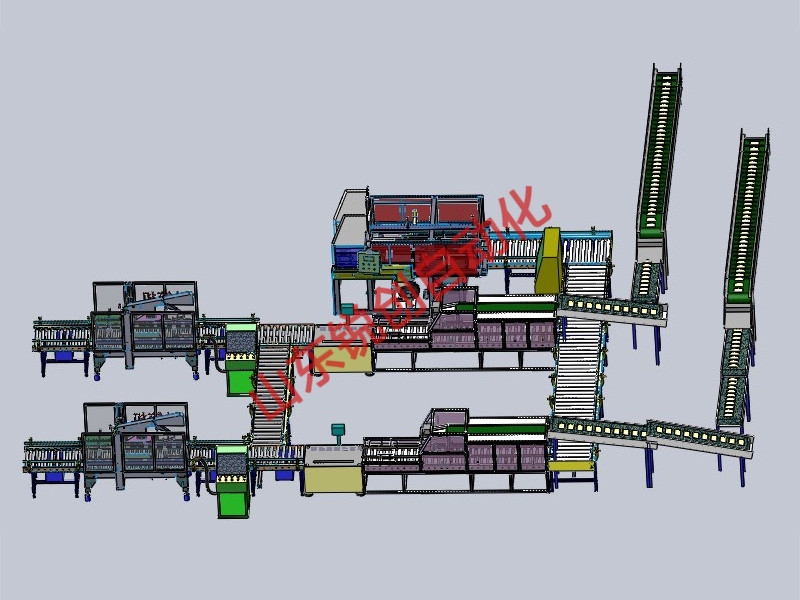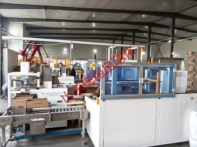 玻璃瓶高速開箱、放紙板、機器人抓取裝箱生產(chǎn)線